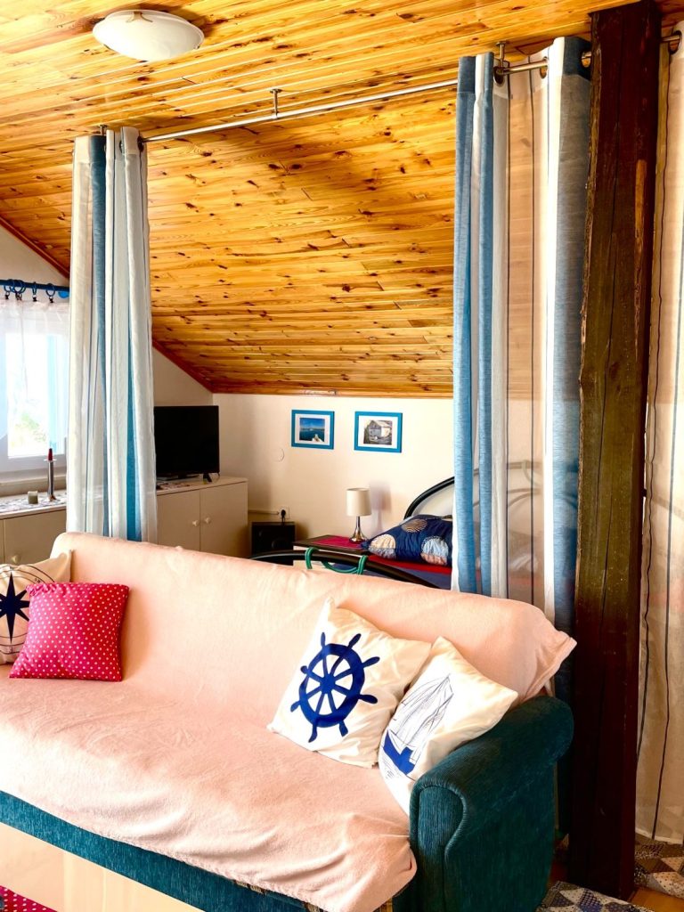Das Studioapartment im ersten Stock besticht mit seiner liebevoll maritimen Gemütlichkeit und dem grandiosen Blick auf die blaue Adria vom großen Balkon.